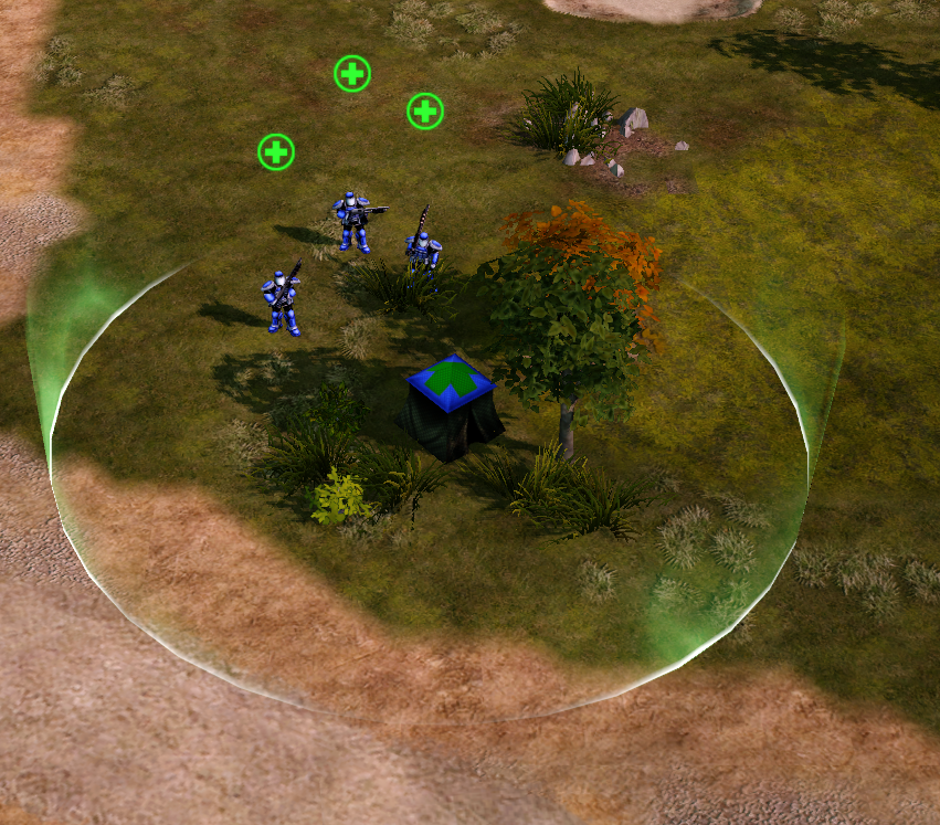 The Allied engineers are equipped with medical supplies, allowing them to heal wounded Allied infantry with ease. However, in order to do so, the engineer must deploy into a first aid tent, which can be brought back down, leaving the engineer mobile again. When multiple first aid tents are deployed close together, they can heal each other and the more of them are deployed the faster they heal. However, being a tent, a first aid tent is not robust enough to be classified as a structure so it can be easily ground away by heavy vehicles.