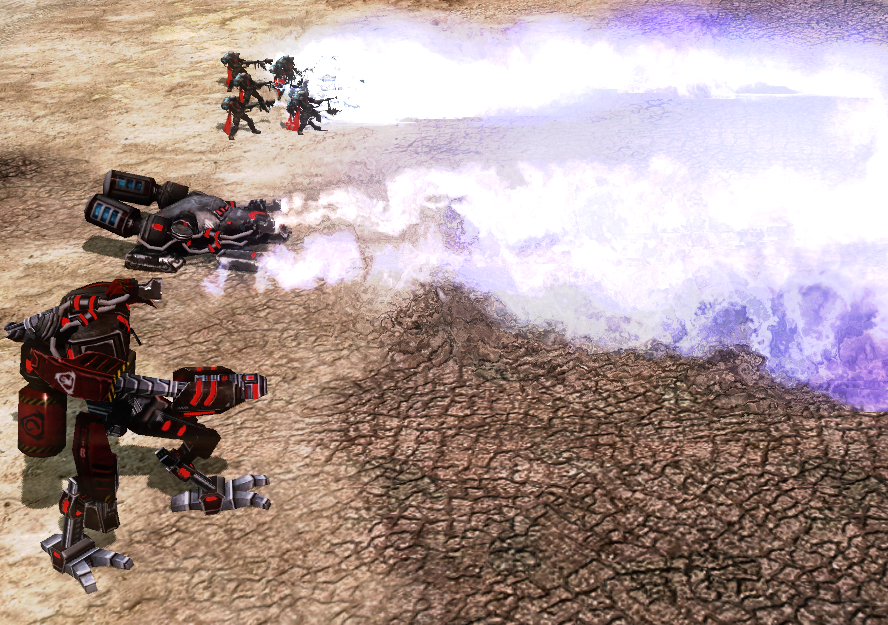 In the Second and Third Tiberium Wars Nod upgraded their arsenal of flame weapons, resulting eventually in the creation of a powerful Tiberium based fuel for their flamethrowers, allowing an unprecedented power of these weapons and effectiveness, to the point of being able to burn through a garrisoned structure killing all infantry inside. In particular, the Black Hand extensively used flame weaponry; their standard Troopers and Purifier Warmech being notable examples of this fascination. The Black Hand has also researched the Purifying flame, an even more powerful fuel mixture that vastly increases the burn temperature, and therefore, the damage. This upgrade will be a threat to all ground units.