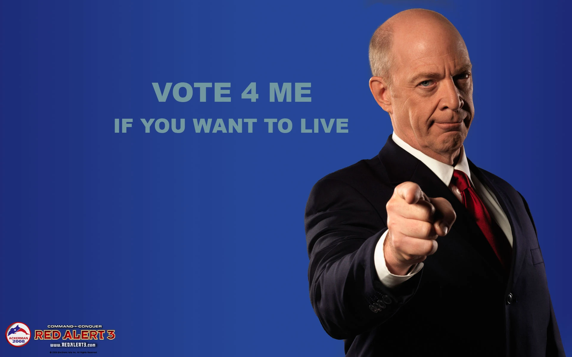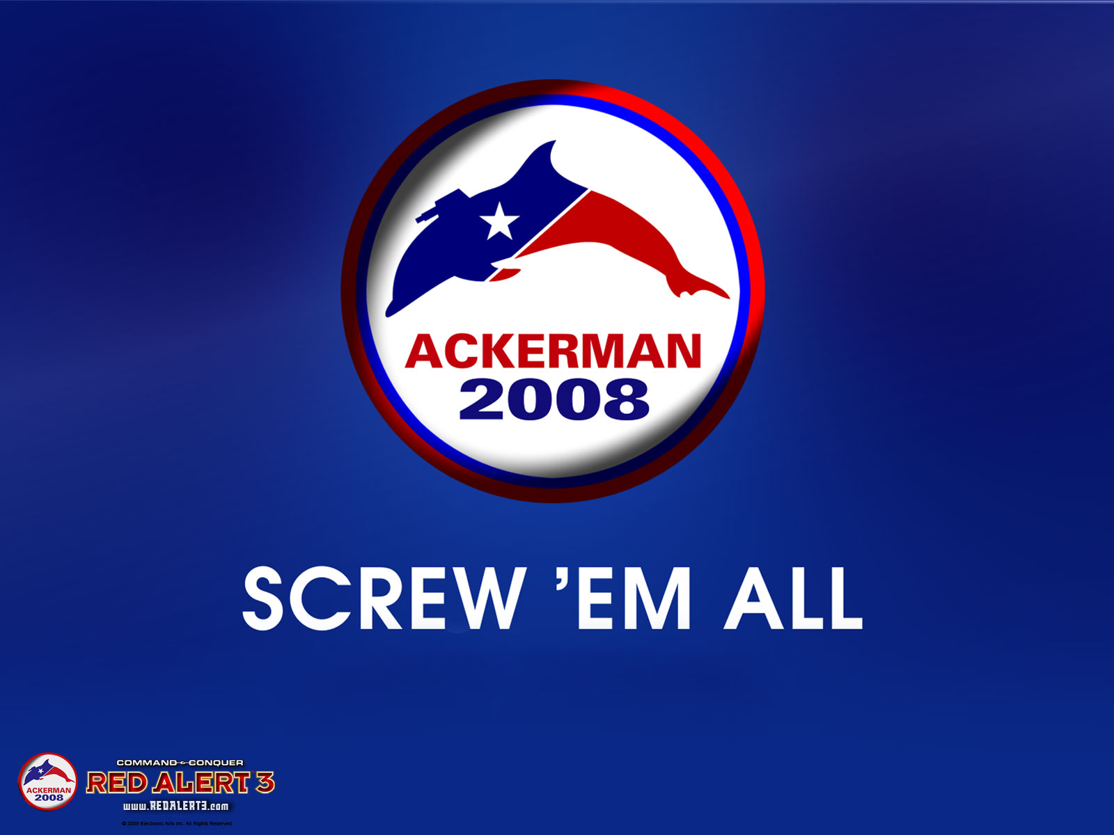 During the 2008 United States presidential elections, Electronic Arts published several comical video clips, in which Ackerman promotes himself to become the next President of the United States in his fictional "Screw 'Em All" campaign. His political slogan was "Vote for me, if you want to live". In fact, 43 people voted for Ackerman during the 2008 presidential elections.[3]