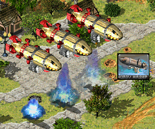 While extremely resistant, and has destructive firepower, Kirov Airships are dramatically useless for guard duties. They will only drop their bombs when the target is directly underneath, meaning that by the time the bomb reaches and explodes on impact, the hostile unit will have gone sufficiently far away from the blast zone. Therefore as such, force-firing the ground is a favored tactic. However, they are effective when placed over areas where AI masses units before attacking base or over attack routes to thin out enemy units, especially against infantry.