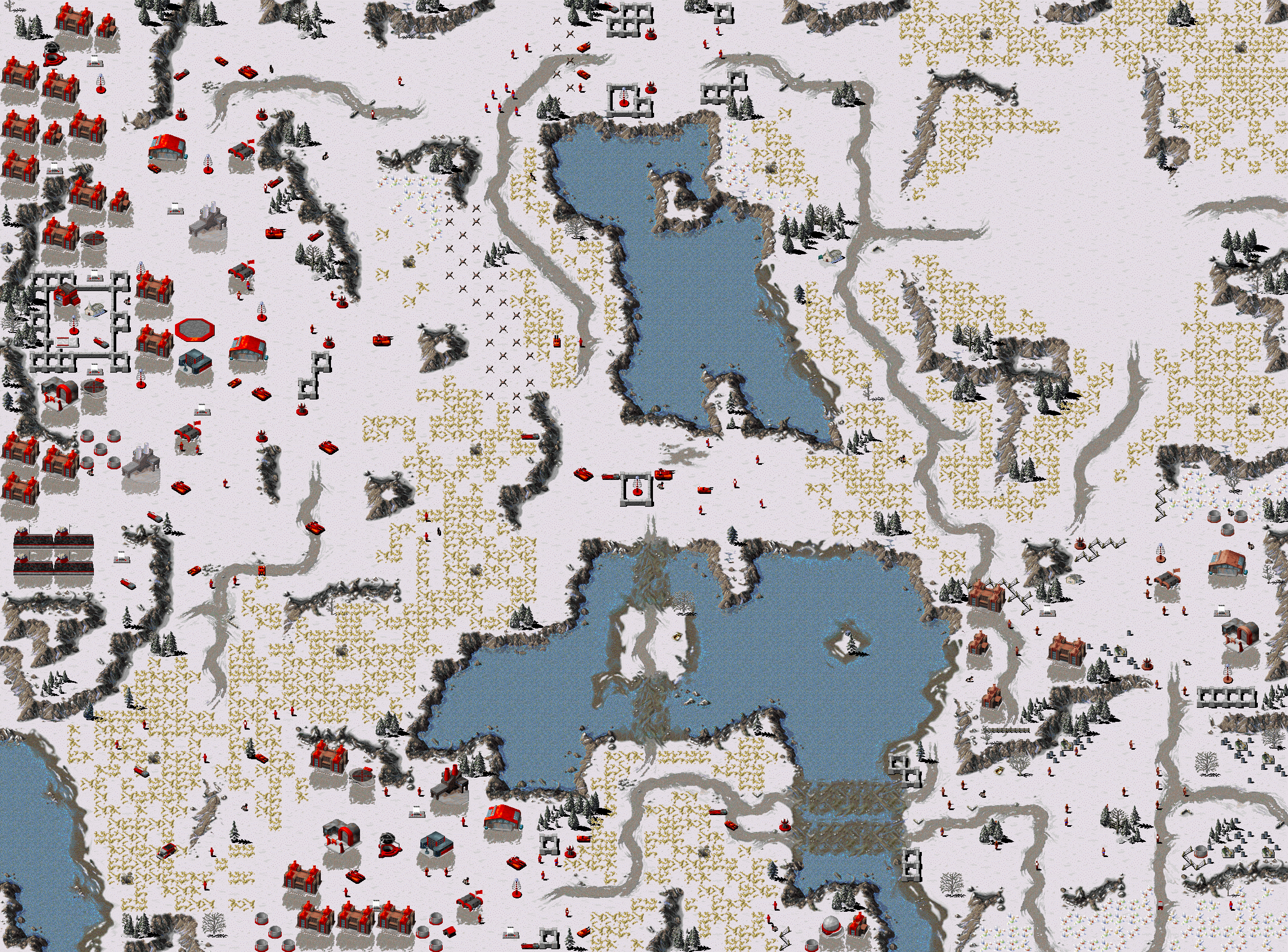 There are two large bases the Soviets have with one that can be taken out easily. The enemy will sell all the buildings if the Construction Yard, Ore Refinery, Barracks, and War Factory are destroyed. It is close to a body of water and with the Chronosphere, if you can get a cruiser on the water, you can easily take down the enemy base with a single cruiser.