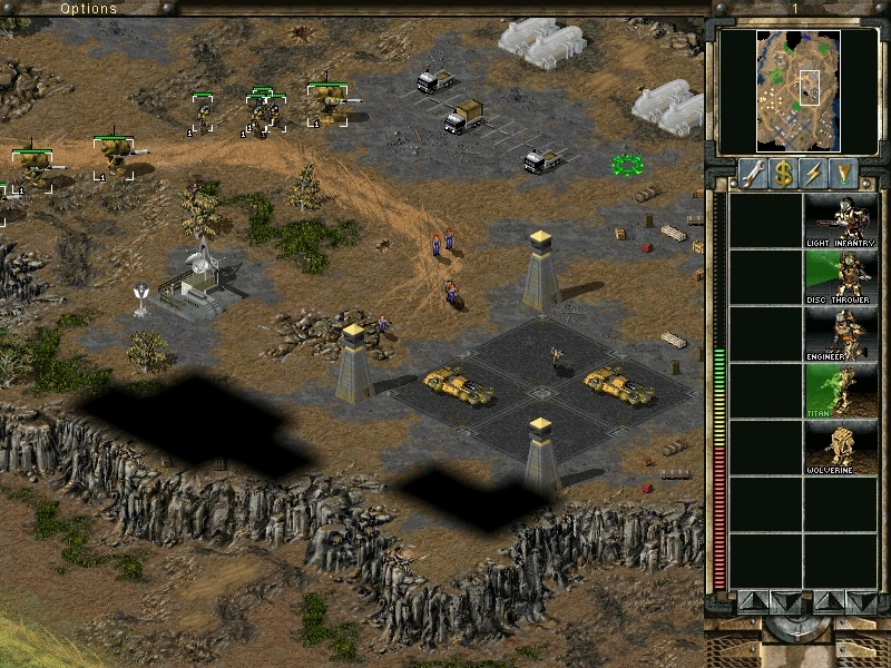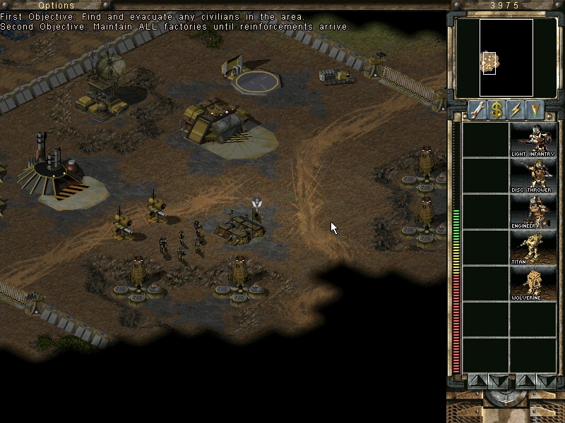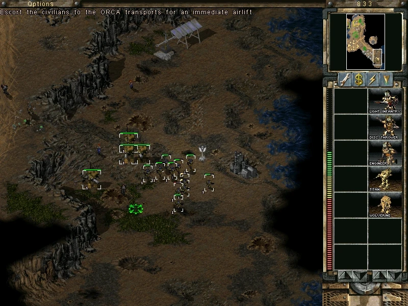 Titans will do a much better job of countering the Tiberian lifeforms than Wolverines or infantry, so it's best to spend most of your credits accordingly. Build up a force of Titans to venture out - at least five would be the minimum, preferably more. You do not have a construction yard so do not allow any of the production facilities to be destroyed. The lifeforms will attack in four waves to attack four civilian settlements - first the southeast, then the northwest, then the northeast, then the southern city. It isn't necessary to protect the structures, but your objective is to keep the civilians alive. Move your group of Titans in to clear out the Tiberium lifeforms; once each wave is destroyed, escort the surviving civilians to the evacuation point, which is just northeast of your base.