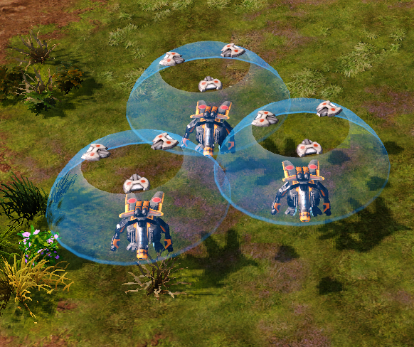 This ability grants all surface units within the target area a shield projected by three hover drones, which can absorb up to 200 points of damage from enemies. The actual area of effect is slightly larger than the outer rim of the cursor symbol. Damage will be indicated by smoke from one or multiple drones. All drones disintegrate simultaneously when maximum damage has been absorbed. If damaged, the shield can be repaired by repair drones.