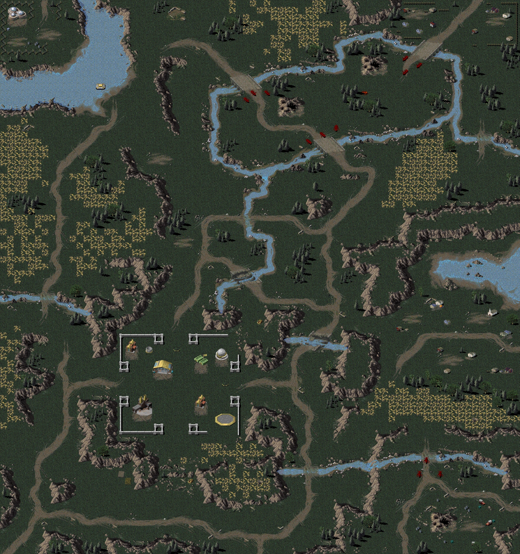 Who would've believed it -- Giant Ants. Now that your MCV has arrived, we must evacuate the civilians in the area -- they don't stand a chance against these ants. There are two villages in your immediate area. Locate them and evacuate the civilians to the island in the northwest. You'll also have to take out all the bridges in this area to stop the ants from completely overrunning you. You must destroy the bridges, and evac at least one civilian from each town for the mission to be a success.