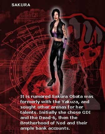Sakura was hired by GDI to work with the Project: Shadow Strike unit, later known as the Dead 6 alongside then-captain Nick Parker. During one assignment, she was separated from her team and ambushed by Nod troopers. Since she was never heard from again, she was assumed dead.