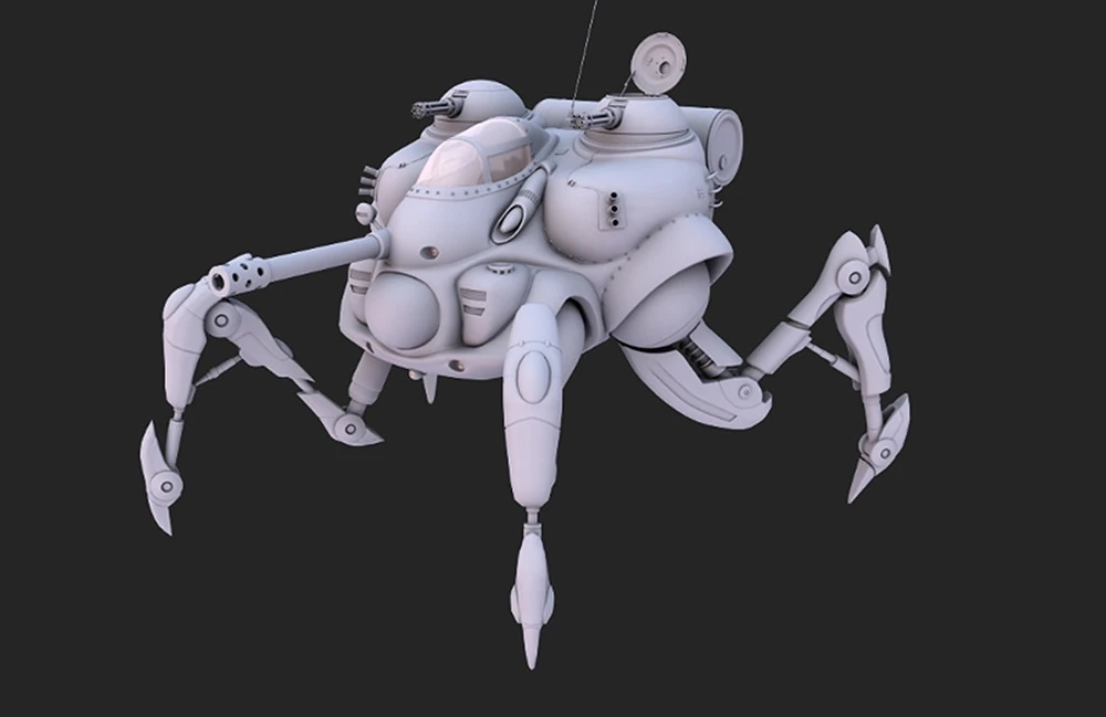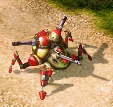 The resulting KDB-9 Sickle is a militarized variant manufactured from an inexpensive alloy that allows quick machining at a low cost and is effective against small arms fire. The pressurized stilt-leg suspension has been reinforced and redesigned to allow the walker to effectively jump over obstacles and terrain features, while maintaining its speed and maneuverability. The Sickle can easily jump into enemy troop formations and scatter them, while its machine guns take out any survivors.[2]