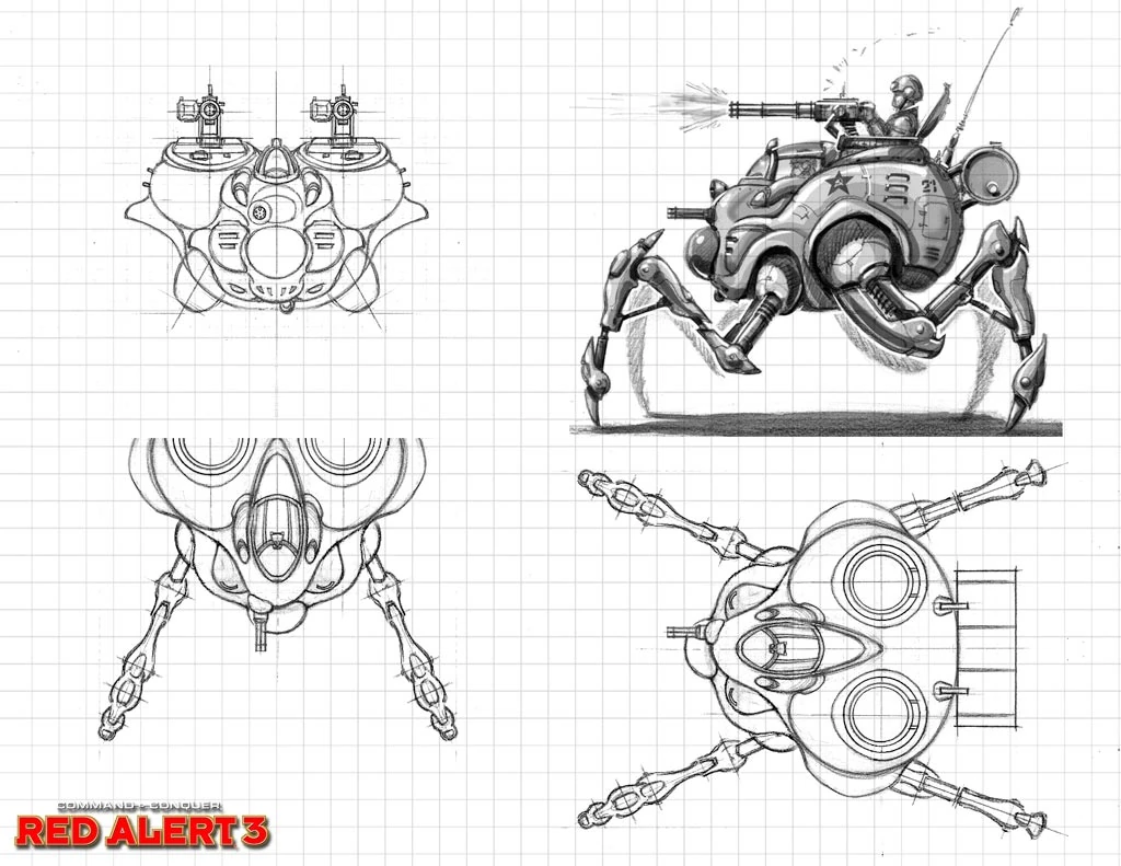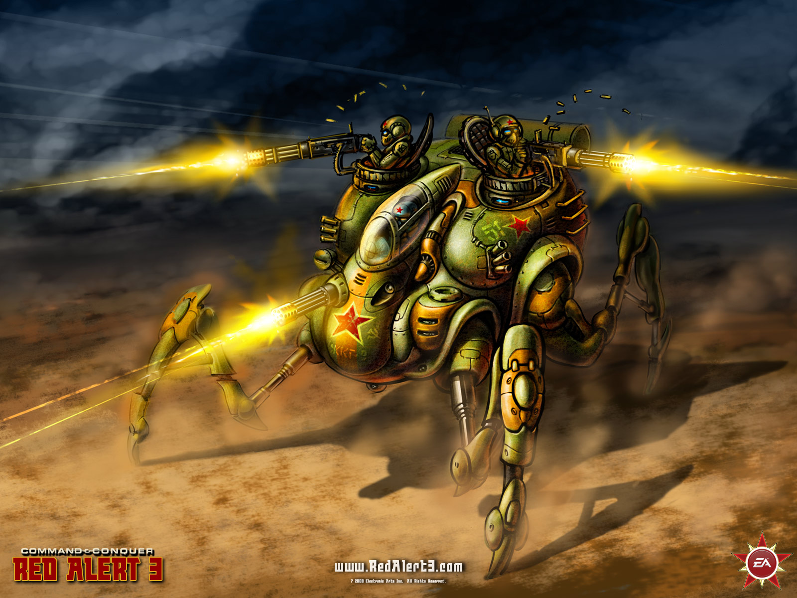 The Sickle's dramatic spiderlike shape--clearly a response to Sversky Robot Works' infamous "Terror Drone" remote-operated military scout created almost a decade prior--quickly deterred crime in some areas. However, occasionally the Sickle had the opposite effect, provoking an already-disrespectful and ungrateful populace into full-on riots and street fighting. It was through several of these incidents that the Soviet military took notice of the vehicle, for it managed to cut down a staggering number of traitorous men, women, and children in record time. (How foolish they were to poke fun at the Sickle!) In spite of the spindly look of the vehicle, it proved stable and fast enough to allow its three machine gunners a near-perfect vantage point for silencing enemy combatants.