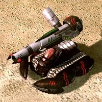 Essentially a lightly-armored tracked vehicle with a large caliber cannon mounted on its top, the design of the vehicle seems to be based on the scorpion, Nod's traditional symbol. In order to fire, it needs to deploy itself by spreading six "claws" that provide a stable platform for the large caliber weapon. In order to allow it to safely reach its destination and prevent premature detection by enemy scouts, the Specter, as its name suggests, is outfitted with a state-of-the-art stealth generator. The high impact shells fired from the cannon follow a high-arc trajectory and do tremendous amounts of damage, especially against structures, with a large blast radius. Care should be exercised when using the Specter, lest there be friendly fire incidents due to the large blast radius from its shells.