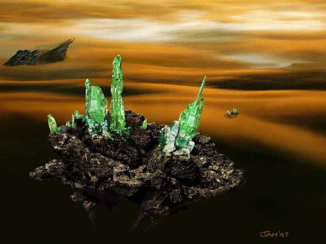 Tiberium was originally brought to Earth by a meteor that landed near Tiber River in 1995. According to Nod propaganda, this event was prophesized by Kane.[2][3] The original form of Tiberium was almost organic in nature, sprouting out of the ground in what seemed to be plant-like pods.[4] Using its underground "roots", it leeched ground minerals and soil nutrients from the earth, forming Tiberium crystals on the surface. The Tiberium crystals were rich in precious metals and available for collection for a minimum of mining expense.[5] Because of this, Tiberium was initially thought to be relatively harmless, and in fact, beneficial.[2]