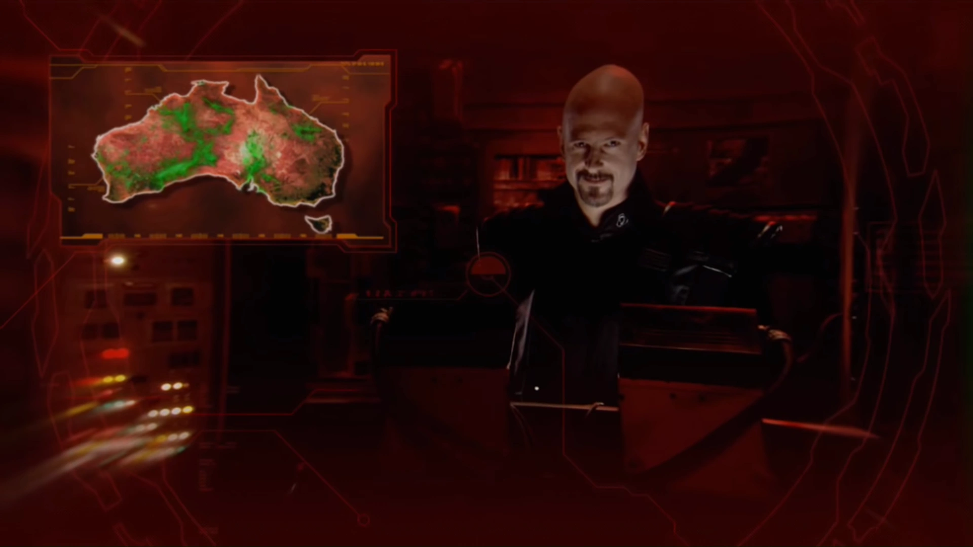 Kane showing the liquid Tiberium detonation's effect on Australia