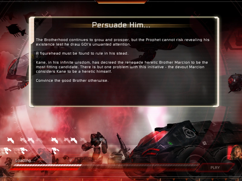 The Brotherhood continues to grow and prosper, but the Prophet cannot risk revealing his existence lest he draw GDI's unwanted attention.