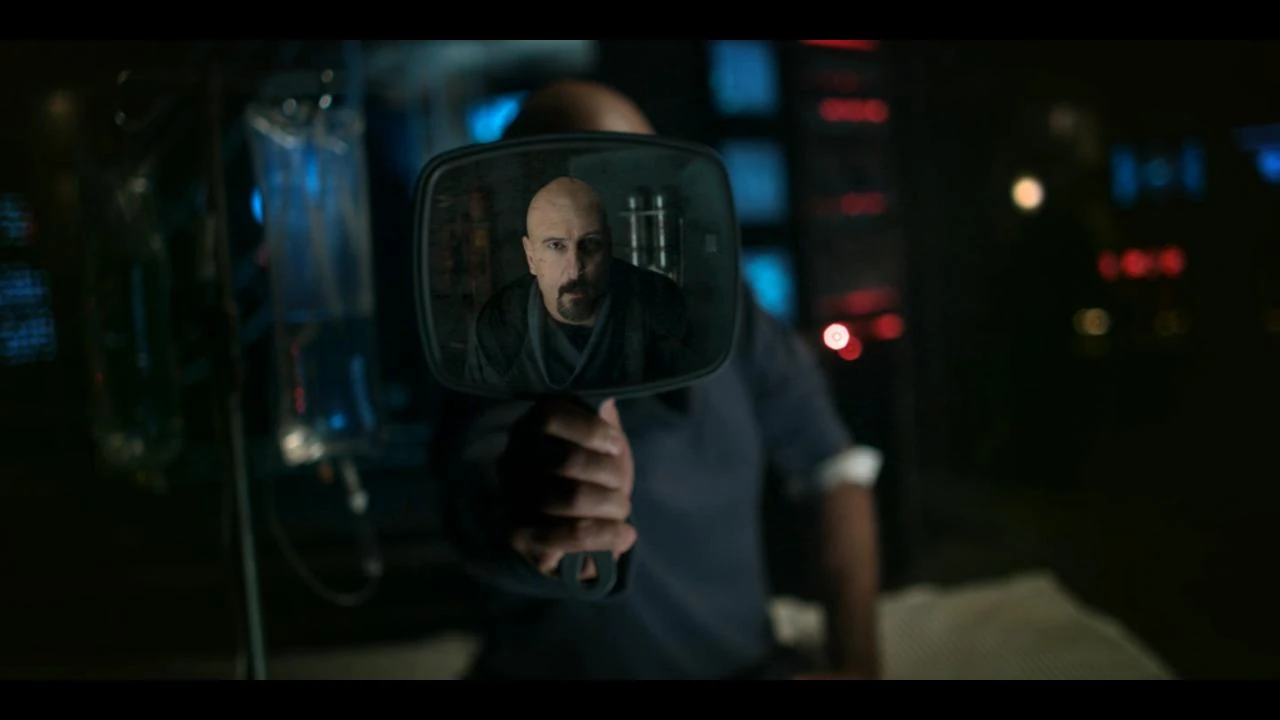 Parker looks in the mirror, seeing his face has been reconstructed to be a mirror image of Kane's.