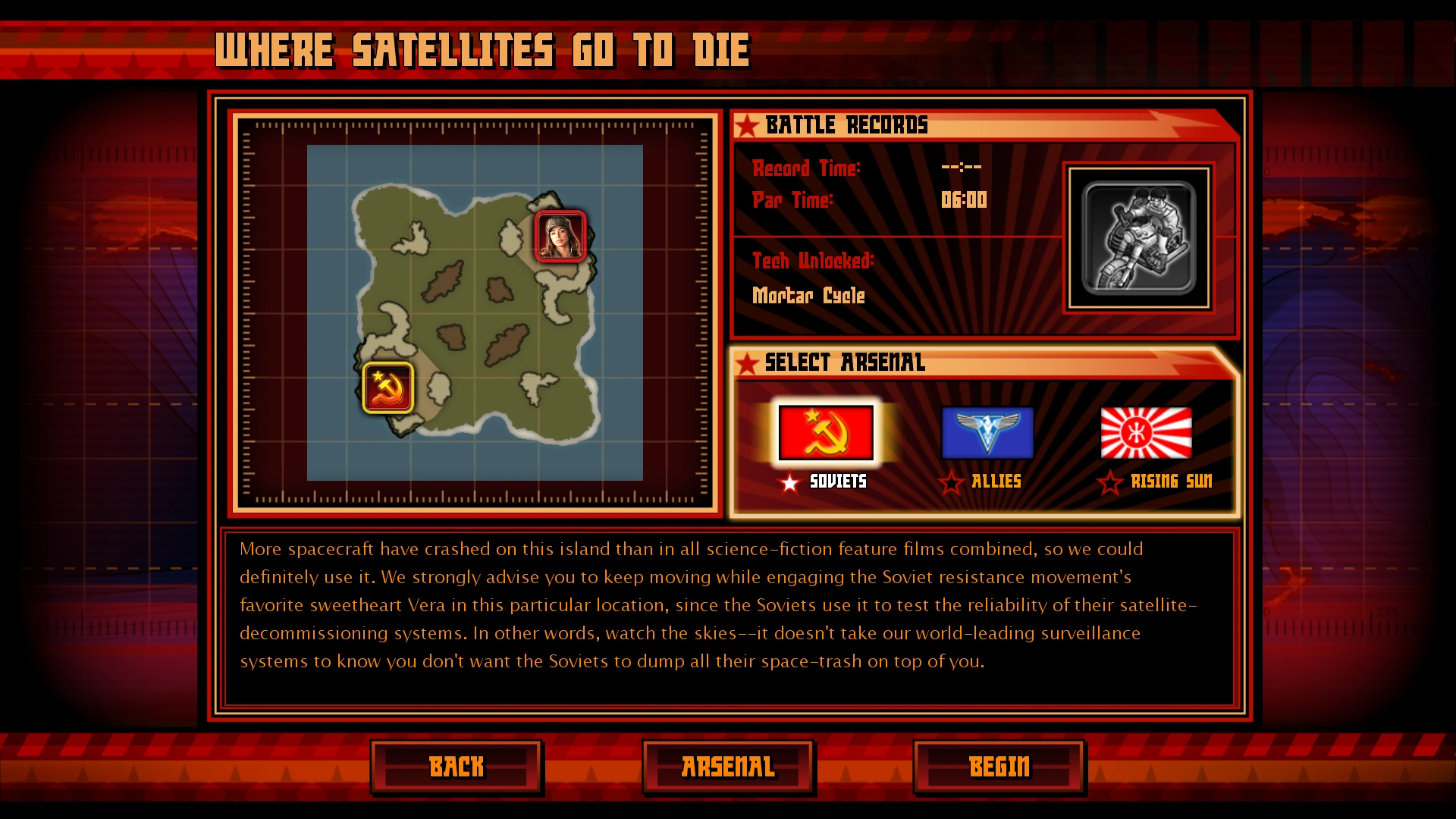 | “ | More spacecraft have crashed on this island than in all science-fiction feature films combined, so we could definitely use it. We strongly advise you to keep moving while engaging the Soviet resistance movement's favorite sweetheart Vera in this particular location, since the Soviets use it to test the reliability of their satellite-decommissioning systems. In other words, watch the skies--it doesn't take our world-leading surveillance systems to know you don't want the Soviets to dump all their space-trash on top of you. - Mission briefing |